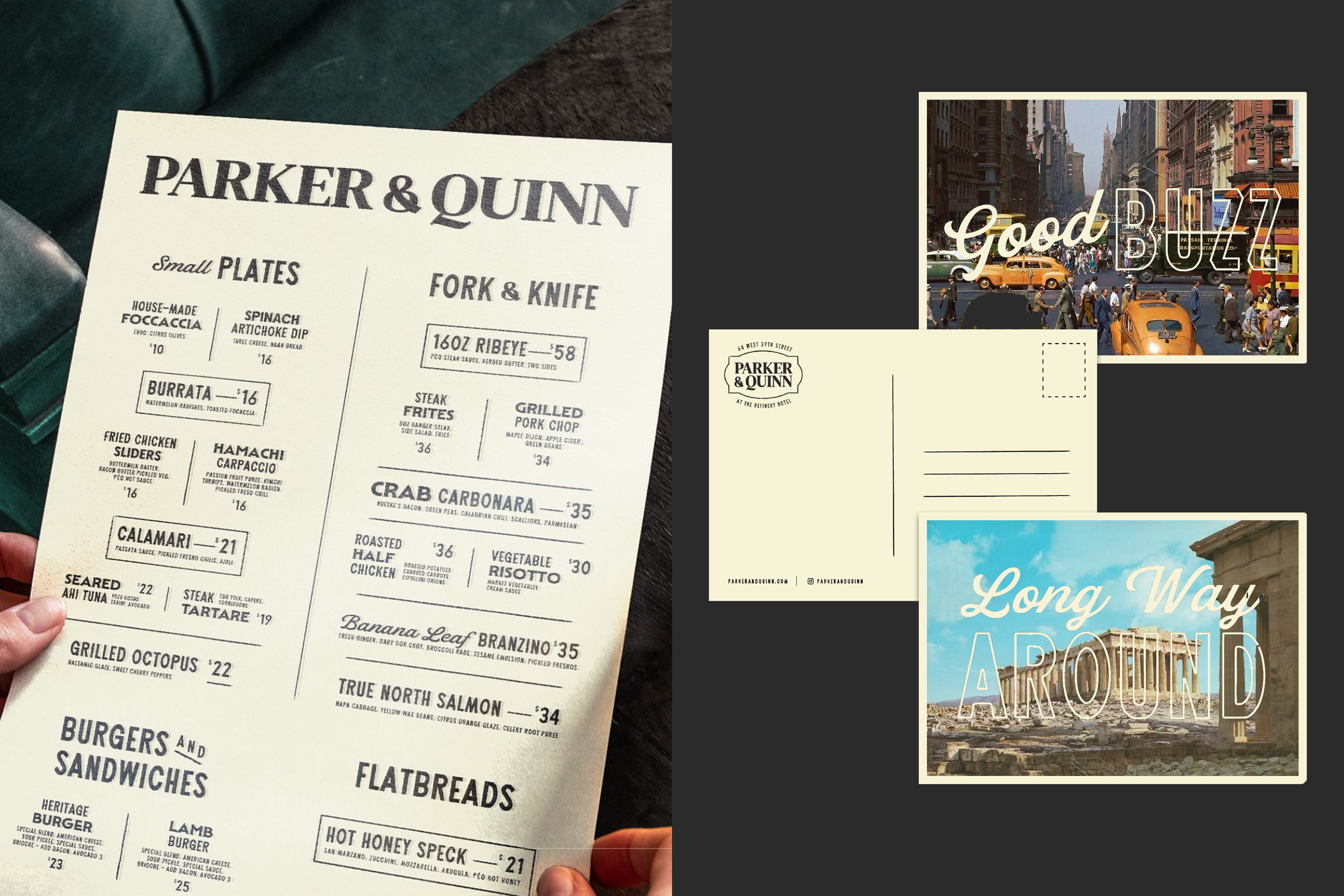 Over the next few years, we updated both Park Ave Tavern and Parker & Quinn in Midtown Manhattan—each restaurant with over a decade of success and beloved by the locals. We aimed to amplify this legacy while positioning the venues for future growth and new locations. We conducted an extensive discovery phase that consisted of interviews with staff and patrons, a thorough brand audit, and a positioning workshop. We then tightened the brand screws on anything that seemed a little loose.