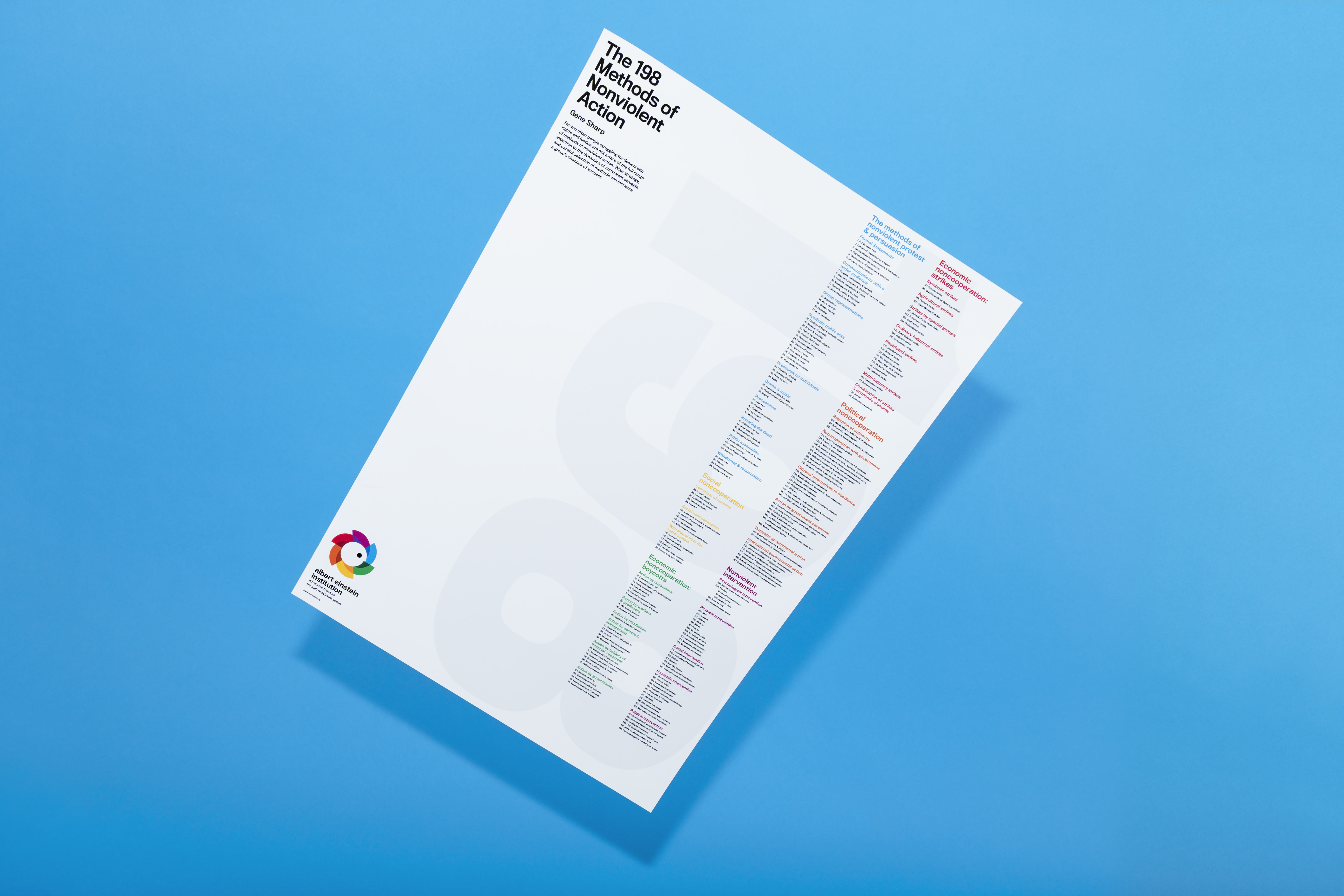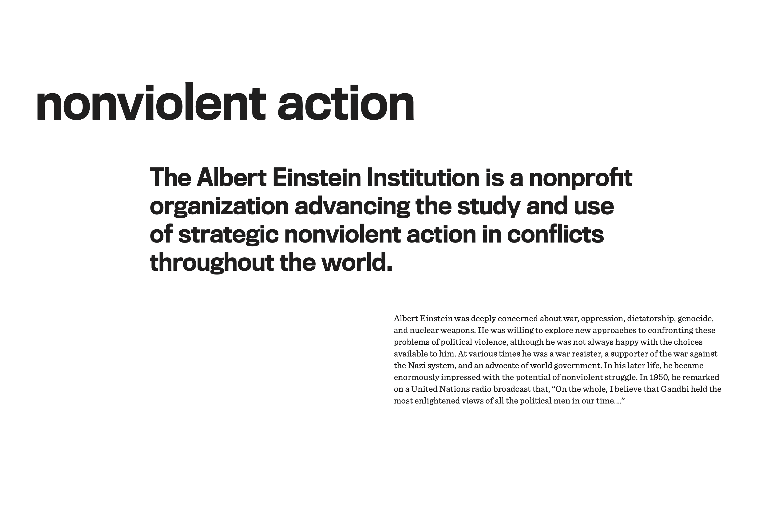 The Albert Einstein Institution is a nonprofit organization founded by Dr. Gene Sharp in 1983 to advance the study and use of strategic nonviolent action in conflicts throughout the world. They are committed to the defense of freedom, democracy, and the reduction of political violence through the use of nonviolent action. The Institution has been responsible for the translation and dissemination of some of the most influential texts on nonviolent action. Many of these works have been studied among resistance movements worldwide.