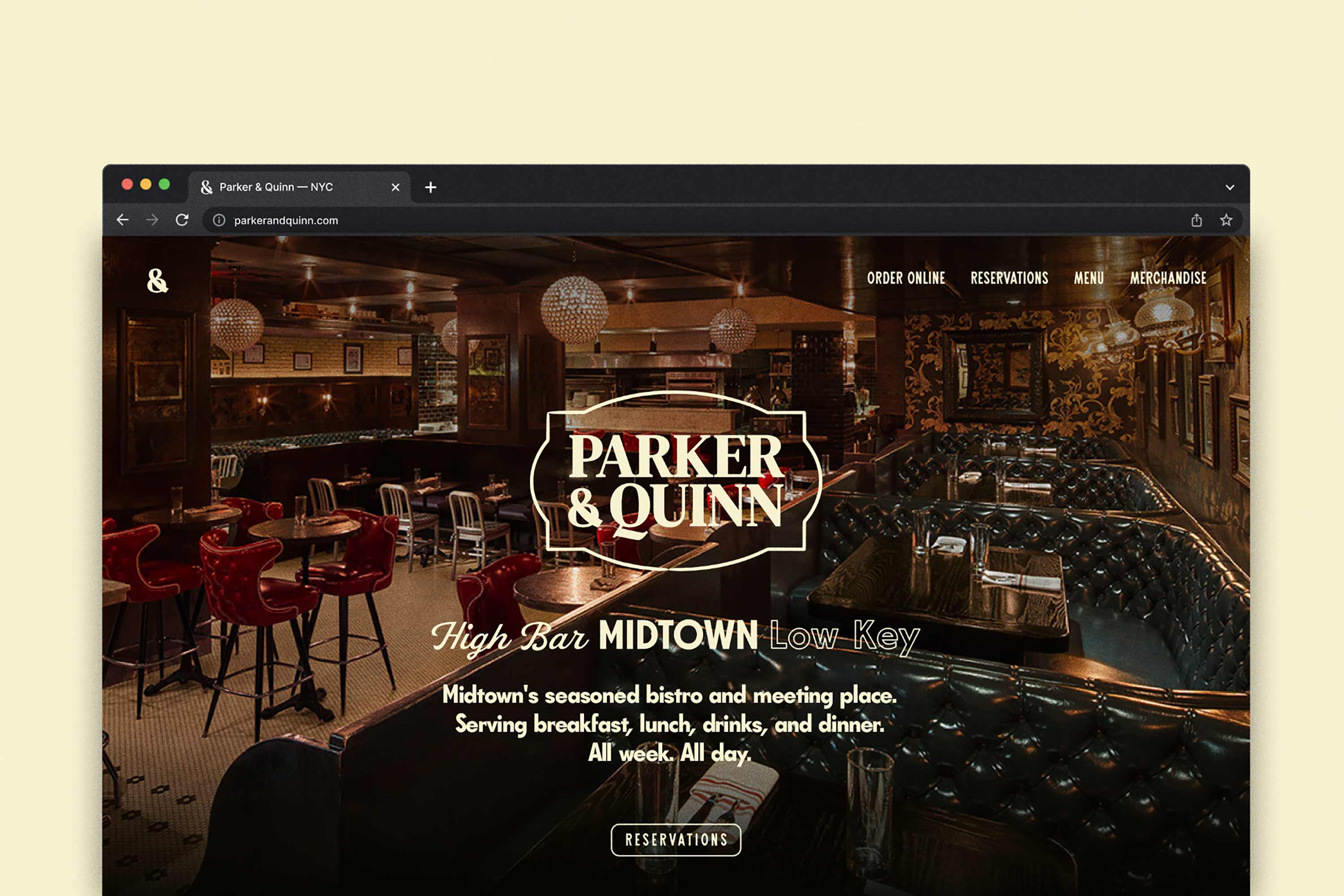 A custom ampersand, an exuberant family of typefaces, pictures of the past, and a zeal for the moment together create an expression of eclectic Midtown and its wide import and export of products, people, and charm. The logo frame brings the two names and distinct shapes together as one, to flexibly represent the restaurant across all communications. In addition, we invented the brand’s new sub-label, Parker & Quinn Global Goods, built for products, wares, and merchandise that capture their love for food, people, and discovery.