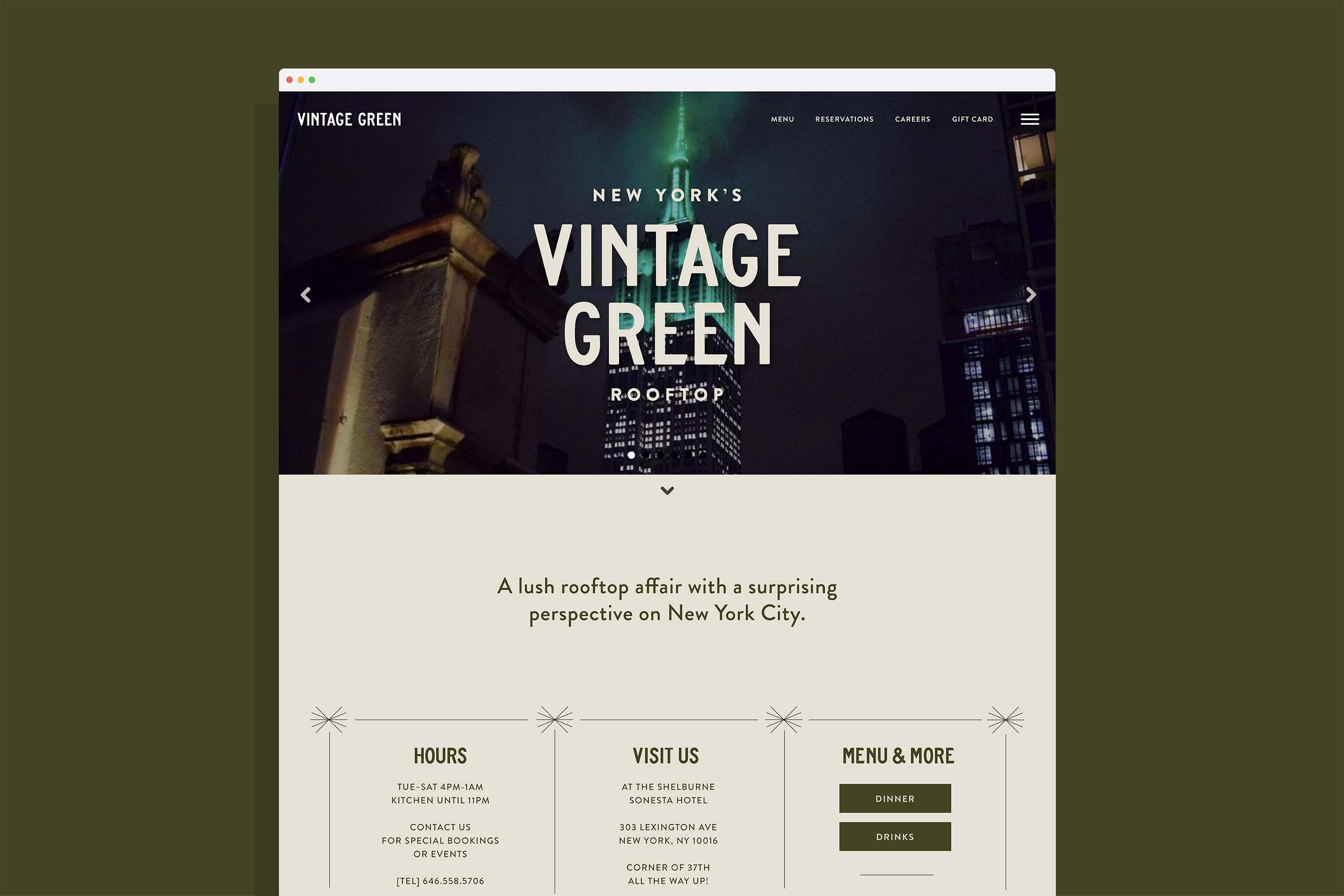 The name conveys a color exact only in its association with historic, human-made design—specifically New York’s imagining of the first U.S. publicly landscaped park. The venue and brand draw on this inspiration of green space as a utopian ideal and curiously superimpose it on the majestic 360-degree view of the city’s ambitious skyline.